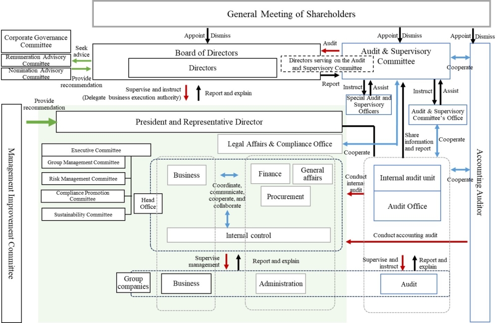 Recognizing that corporate governance is an important management issue, the Company has appointed outside directors to ensure management transparency since its establishment. Previously, the Company had a system of Board of Statutory Auditors. However, with the approval of an amendment to the Articles of Incorporation at the 78th Ordinary General Meeting of Shareholders held on June 24, 2022, the Company became a company with an Audit & Supervisory Committee system. The Board of Directors, which generally meets once a month, consists of 15 directors (including 7 full-time directors and 8 part-time outside directors, including 6 independent outside directors) and makes decisions on basic management policies, matters prescribed by laws and regulations and other important management matters, and supervises the conduct of business. The Audit & Supervisory Committee consists of three independent outside directors and members of the Audit & Supervisory Committee, who attend the meetings of the Board of Directors and other important meetings to monitor the legality and appropriateness of the directors' performance of their duties, as well as the transparency and soundness of management.