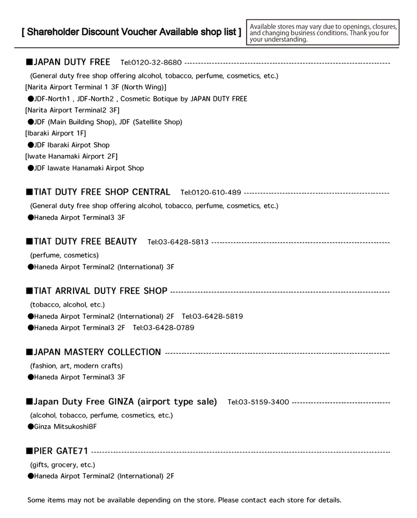 Shareholders who have purchased at least one unit of shares (100 shares) will receive 5 complimentary shareholder discount coupons valid for 10% reduction at designated duty-free stores in Haneda, Narita, Ibaraki and Iwate Hanamaki airports or other locations, when travelling overseas from Japan.