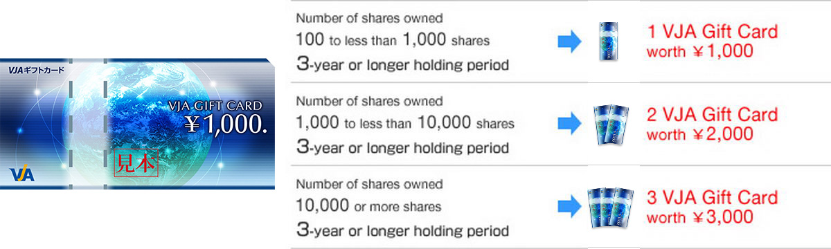 Under our long-term shareholder reward program (*1), every year we send VJA Gift Cards to shareholders of record as of March 31 of the year who own at least one unit of shares (100 shares) of the Company and whose continuous holding period exceeds three years (*2).