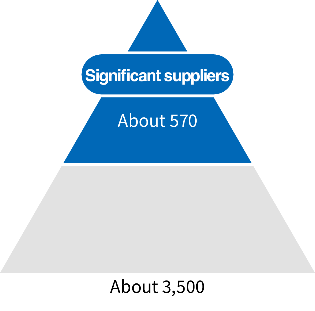 Of the approximately 3,500 Tier-1 suppliers, we have identified the top 10% of such companies, which account for 90% of the transaction amount, from a business perspective. In addition, we have identified tenants and operating partner companies that work together with the Japan Airport Terminal Group to operate terminals as significant suppliers from an ESG perspective, such as labor and environmental management, which are risks specific to the sector. In total, we have identified approximately 570 companies as significant suppliers.