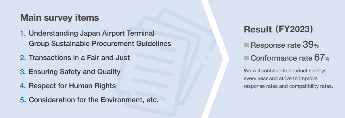 Regarding our procurement activities, we pay attention to environmental and social issues in all business activities, including the entire supply chain, and conduct transactions in a Fair, Just, and Sincere Manner. We will ensure that our business partners are kindly expected to understand the purpose of the “Japan Airport Terminal Group Sustainable Procurement Guidelines”, which summarizes matters that we require them to comply with, respect each other's positions, and build good partnerships based on mutual trust. By doing so, we will conduct responsible procurement activities based on this policy.