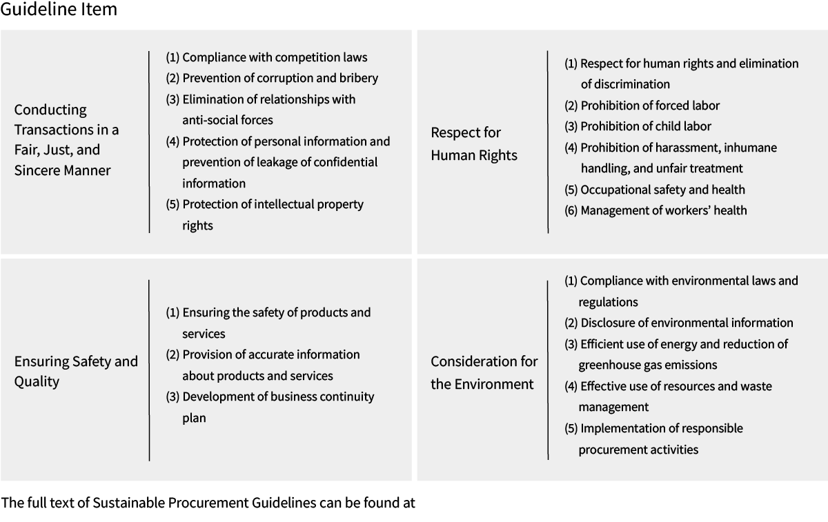In accordance with our Sustainable Procurement Guidelines, the Group aims to conduct transactions fairly and honestly, paying attention to environmental and social issues in all of our business activities and in our supply chain. We are asking our suppliers to understand this and to comply with the guidelines, and have conducted a survey to help us improve sustainability throughout the supply chain. In addition to conducting a survey to determine whether our suppliers comply with the Sustainable Procurement Guidelines, we are also working with the Human Rights Subcommittee to conduct additional surveys in business areas where human rights risks have been identified as high.