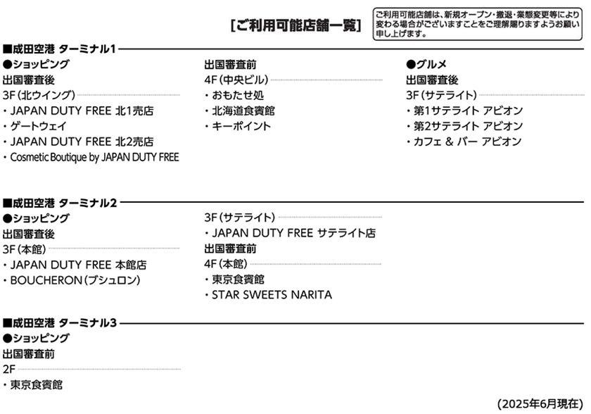 成田空港でのご利用可能店舗