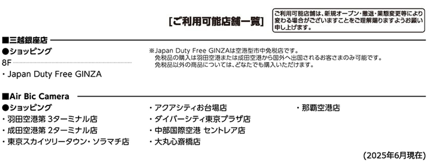 - ご利用可能店舗は、新規オープン・撤退・業態変更等により変わる場合がございますことをご理解賜りますようお願い申し上げます。