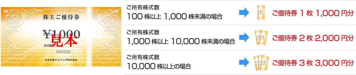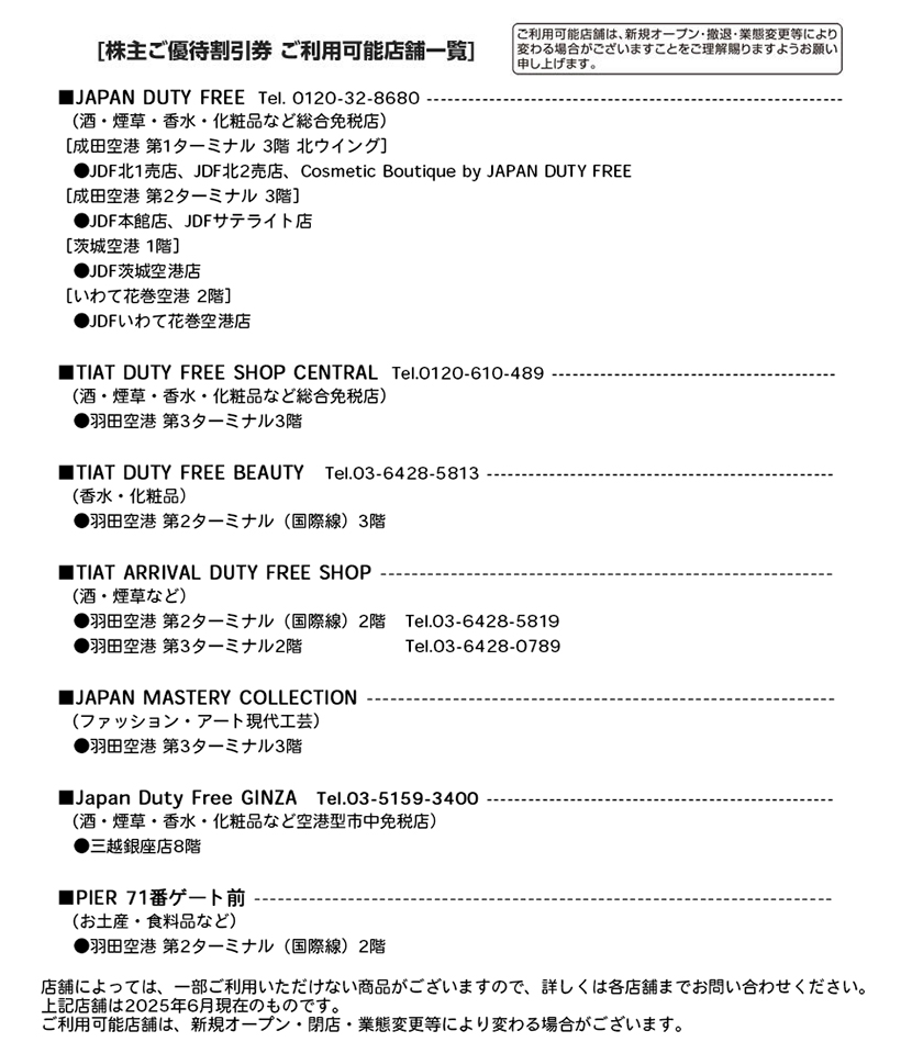 海外へご出発の際に、羽田空港、成田空港、茨城空港およびいわて花巻空港内等の当社指定免税売店でご利用いただける「株主優待割引券(10%引)」を1単元(100株)以上ご所有の株主さまに対し、一律5枚配布します。