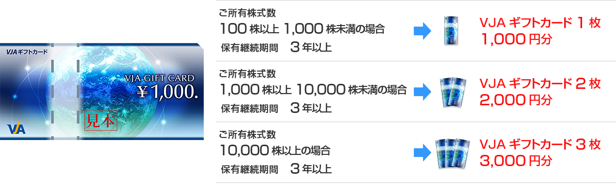 また、長期優待制度(※1)として、毎年3月31日現在の株主名簿に、当社株式1単元(100株)以上の株主として記載又は記録され、保有継続期間が3年を超える株主さま(※2)を対象に「VJAギフトカード」を年1回配布します。